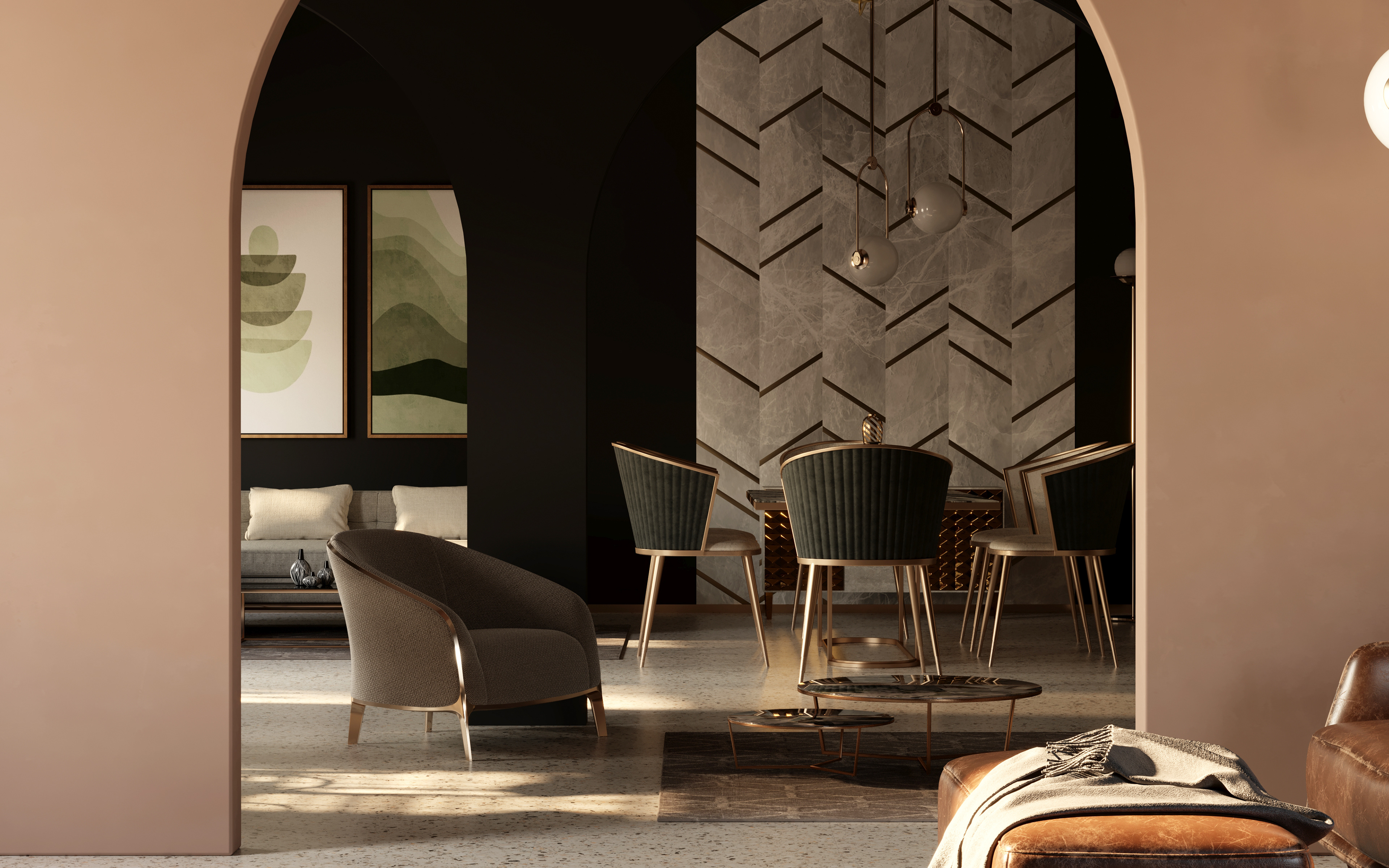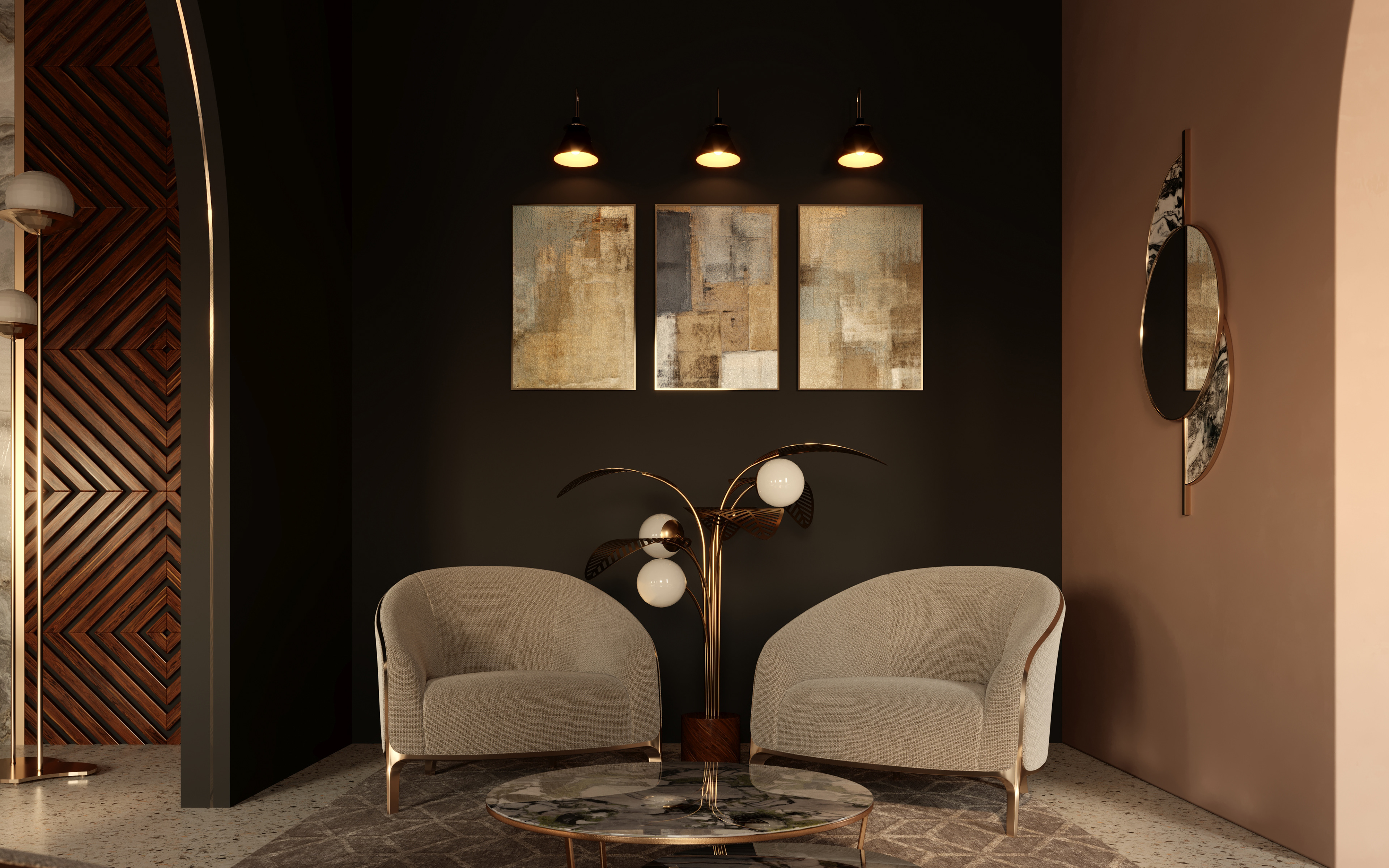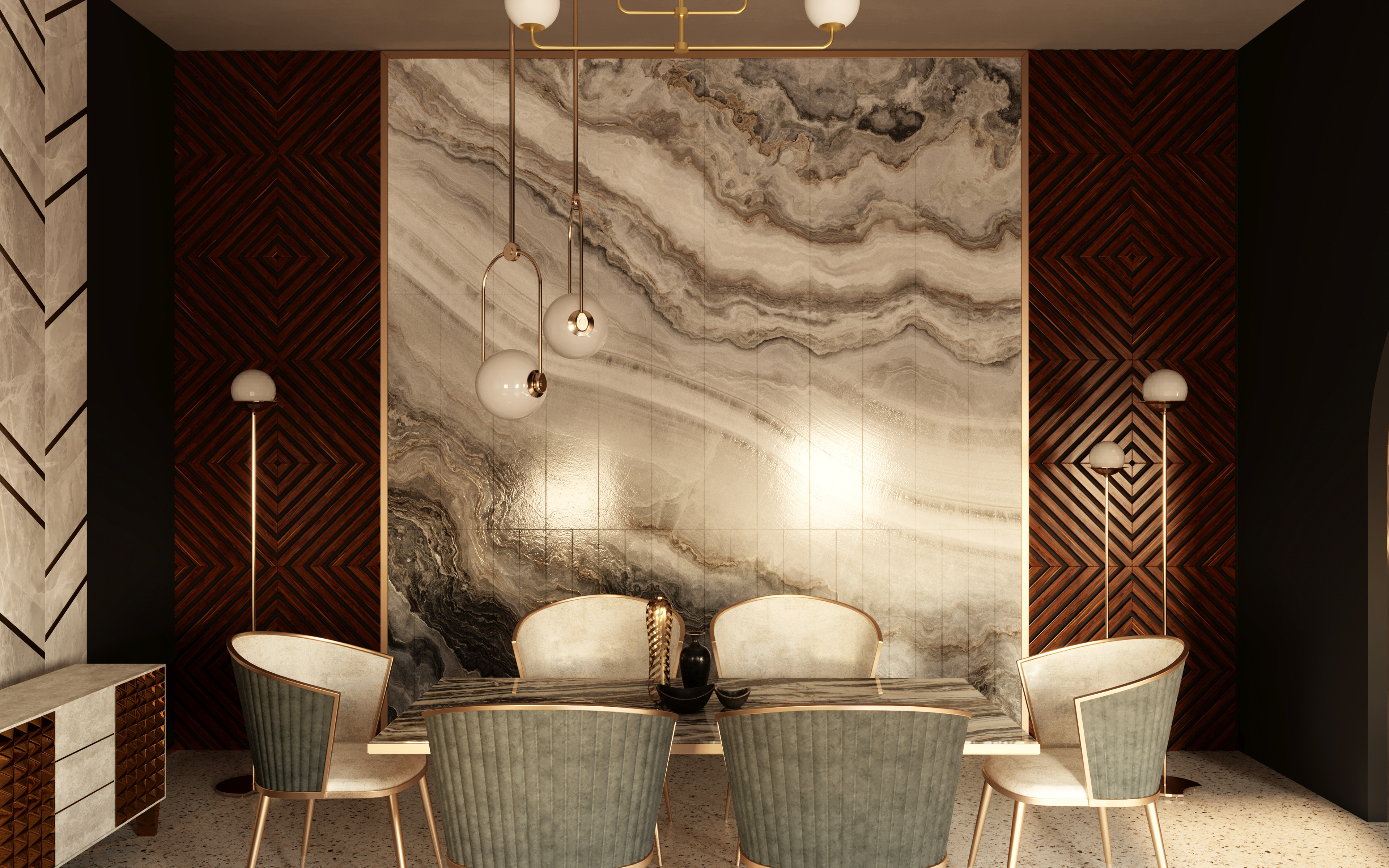 An Art Deco inspired interior of a Recepetion Hall using a bold mixture of wall colors with golden finishes...